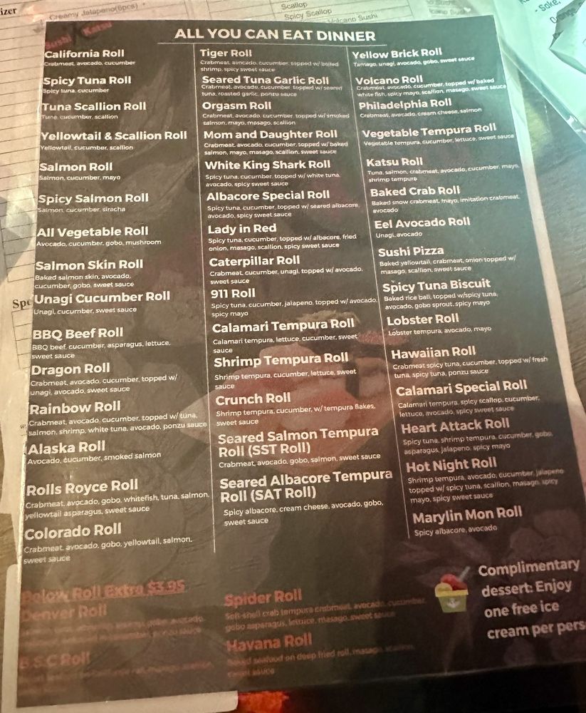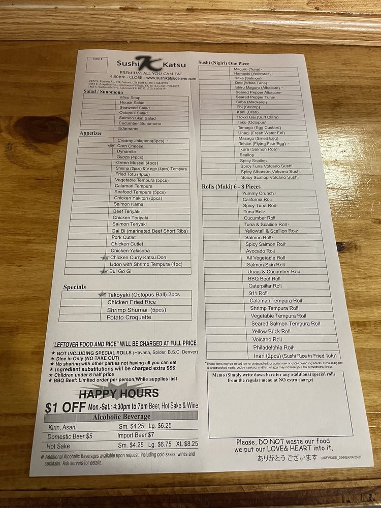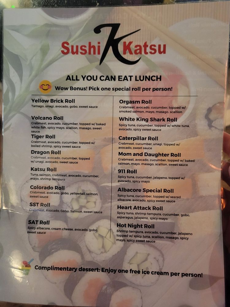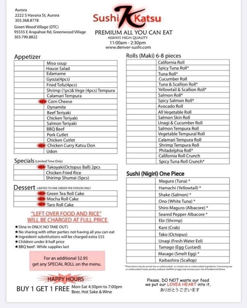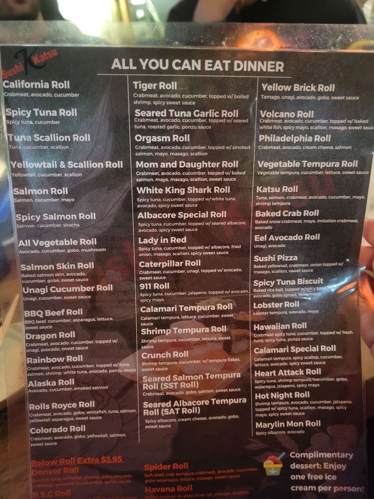 Sushi Katsu in Aurora offers a diverse menu with a range of options, including vegan and vegetarian choices. The restaurant provides a casual dining experience with moderate noise levels, making it suitable for groups, kids, and both lunch and dinner outings. With features like outdoor seating, full bar, and happy hour specials, Sushi Katsu ensures a pleasant dining experience. Customers praise the fresh and tasty sushi, fast service, and generous portions. The all-you-can-eat deal is a standout offering, with options like the Volcano Roll earning rave reviews. While there may be a wait during peak hours, the friendly staff and delicious food make it worth it. Sushi Katsu is a favorite for sushi lovers in Aurora, known for its quality fish and varied selection. Overall, Sushi Katsu is a top choice for those craving delicious sushi in a welcoming atmosphere.