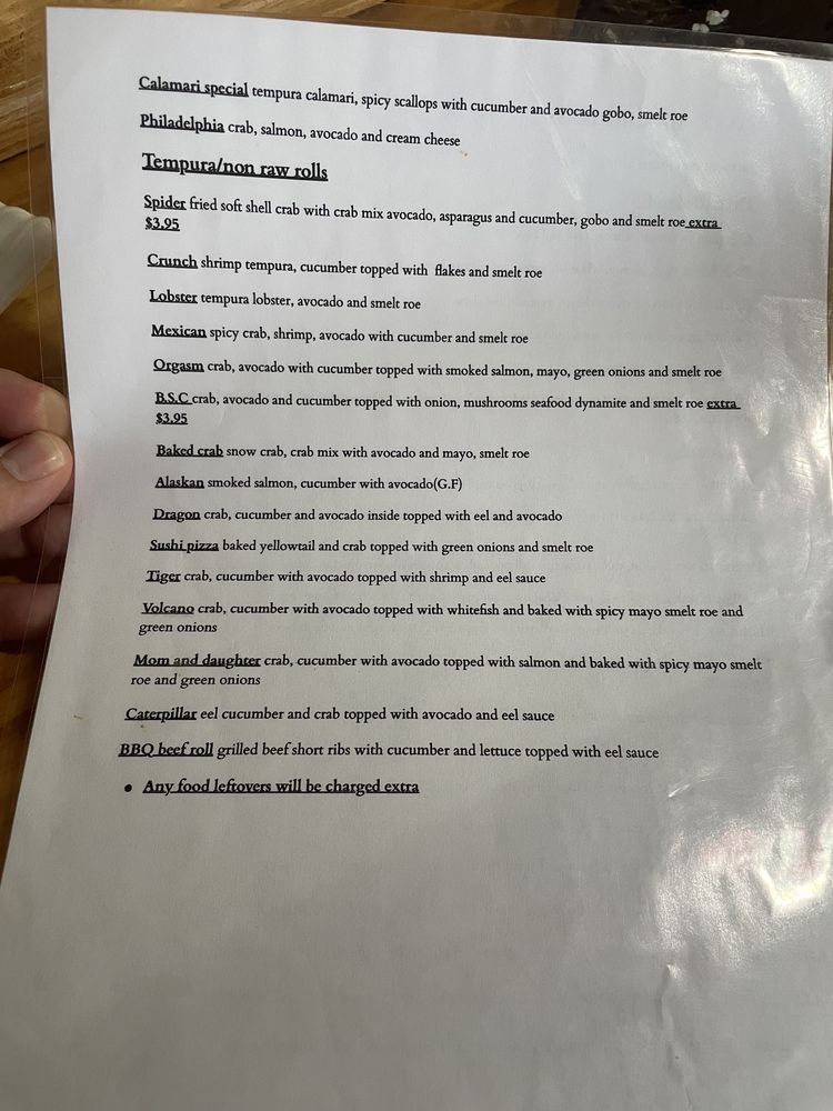 Crabmeat, avocado, gobo make a deep fried roll and topped with baked scallop, mushroom, onion, garlic, smelt egg, and scallion.